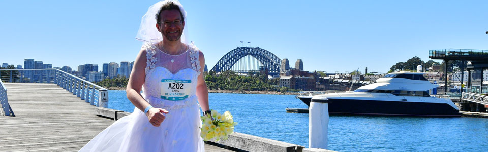 Blackmores Sydney Running Festival It's one of the world's most scenic marathons, finishing at the Sydney Opera House - and Chris Gee ran it in a wedding dress complete with bouquet, finishing in 5:46:03